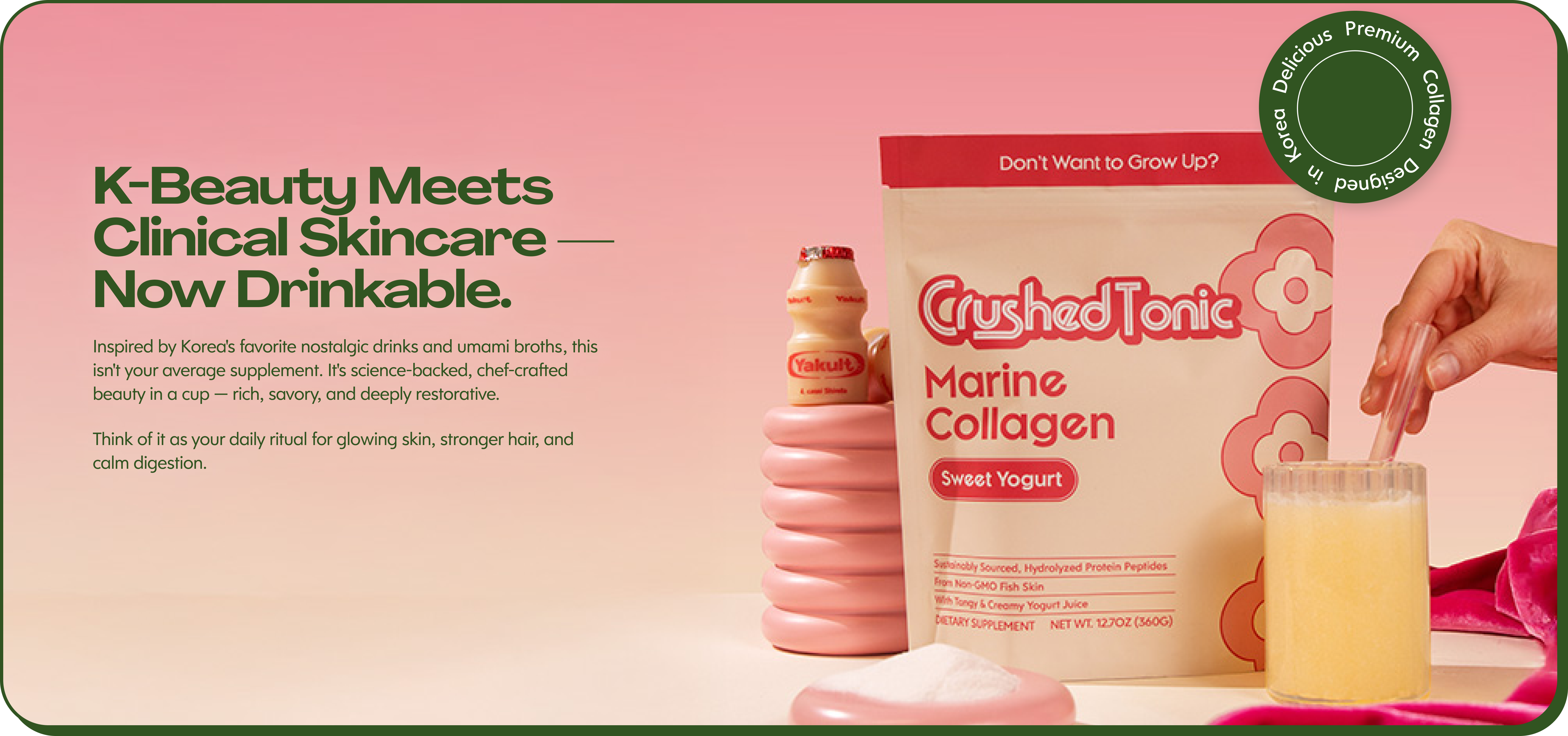 Nostalgic banana milk flavor, zero grit, clinically proven peptides. Your daily beauty ritual — simplified.